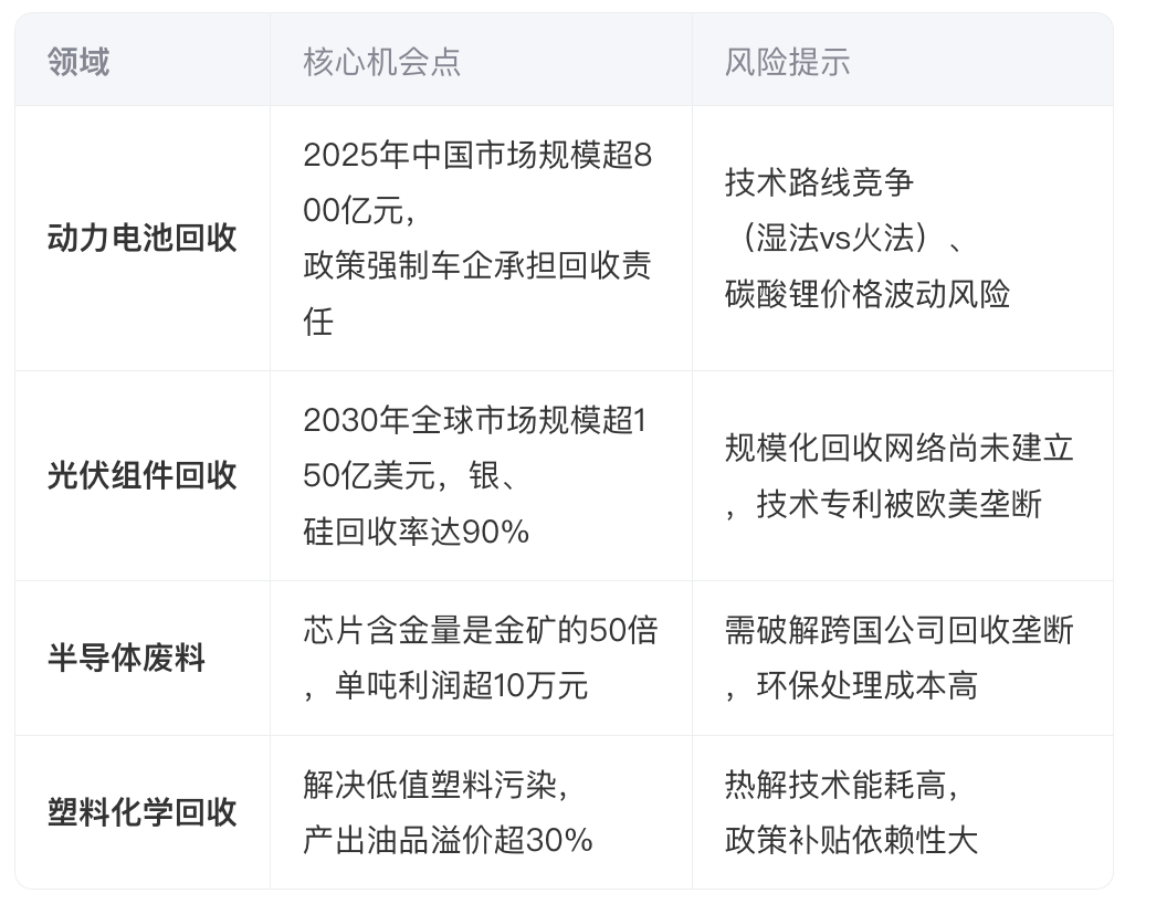 技术壁垒:动力电池拆解需防爆、防污染技术,光伏板回收依赖氟化物处理专利,中小企业难以突破。